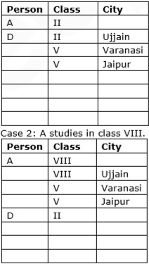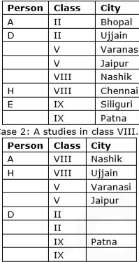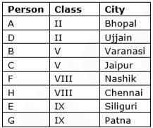 Person - A, B, C, D, E, F, G and H City - Varanasi, Nashik, Chennai, Siliguri, Ujjain, Bhopal, Jaipur and Patna Class - II, V, VIII and XI 1. A studies in an even numbered class. The one who lives in Ujjain studies with A. The one who lives in Varanasi and Jaipur study in the same class, but in a class lower than VIII. D studies in a class lower than that of the one who lives in Varansai.