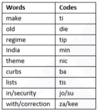 Study the following information to answer the given questions: In a certain code, ‘make security in theme lists’ is written as ‘jo ti tis su nic’, ‘India make old regime’ is written as ‘die min tip ti’, ‘old lists with correction’ is written as ‘za tis die kee’ and ‘theme curbs regime’ is written as ‘tip ba nic’.