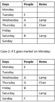 1) E buys table before Wednesday. 2) Three people goes to the market between E and B. 3) The one who goes to the market on Thursday buy Chair. (So, there can be two possible cases) Case-1: If E goes market on Tuesday: 4) A goes to the market immediately before G. 5) Two people go to the market between G and F. 6) Only A and the one who goes to the market on Saturday buy Lamp. 7) F neither goes to the market on Thursday nor buy lamp. Case-1: If E goes market on Tuesday: 8) Only one people goes to the market between D who buys Table and the one who buys Chair. 9) C does not buy table. 10) C go to the market neither immediately after nor immediately before B. (From this Case-2 will be eliminated as no place left for C in it. Now, with case-1, it is clear that D goes to the market on Friday and C goes to the market on Monday and C buy Chair)