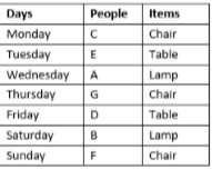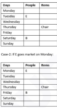 1) E buys table before Wednesday. 2) Three people goes to the market between E and B. 3) The one who goes to the market on Thursday buy Chair. (So, there can be two possible cases) Case-1: If E goes market on Tuesday: 4) A goes to the market immediately before G. 5) Two people go to the market between G and F. 6) Only A and the one who goes to the market on Saturday buy Lamp. 7) F neither goes to the market on Thursday nor buy lamp. Case-1: If E goes market on Tuesday: 8) Only one people goes to the market between D who buys Table and the one who buys Chair. 9) C does not buy table. 10) C go to the market neither immediately after nor immediately before B. (From this Case-2 will be eliminated as no place left for C in it. Now, with case-1, it is clear that D goes to the market on Friday and C goes to the market on Monday and C buy Chair)