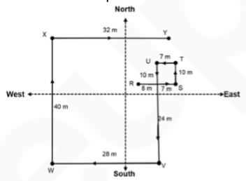 1) Raga started walking in East direction from point R. 2) After walking 15 m she reached point S, from there she takes a left turn and walk 10 m to reach point T. 3) From T, she turns left and walk 7 m and reaches point U. 4) Then, she turns left and walks 34 m to reach point V. 5) From point V she turns right and walks 28 m. 6) Now she reached point W and from there she turns right and walks 40 m to reach point X. 7) From point X she turns right and walks 32 m to reach point Y.