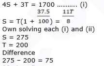 Cost of 4 shirts and 3 trousers is Rs. 1700. If the price of a shirt is 37.5% more than the price of a trouser, then what is the difference between the price of a shirt and a trouser?
