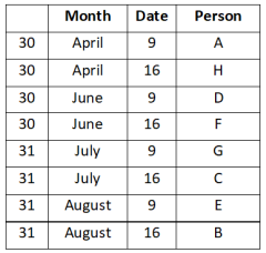 Direction: Study the information given below and answer the questions based on it. There are 8 friends A, B, C, D, E, F, G and H in a group. They have their birthdays in different months - April, June, July and August of the same year but not necessarily in the same order on different dates viz. 9th and 16th. E celebrates his birthday in the month which does not have 30 days. Only one person celebrates his birthday between E and G. C celebrates his birthday immediately before E. Only one person celebrates his birthday between C and F. D celebrates his birthday before G but not immediate of C and G. Only one person celebrates his birthday between D and A. H does not celebrate his birthday immediate of G. G does not celebrate his birthday in the month which has 30 days. A celebrates his birthday before D. D does not celebrate his birthday which has even number as the date of birth. B celebrates his birthday in the month of August but not immediately before or after G.