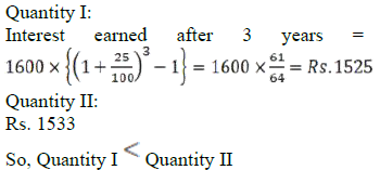 Quantity I: A man deposits Rs. 1600 in a bank at the rate of compound interest of 25% per annum compounded annually. What will be the interest earned by the man after 3 years?