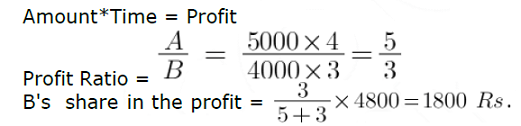 A and B started a business with Rs. 5000 and Rs. 4000 respectively. The time for which A & B invested was in the ratio 4 : 3. If annual profit was Rs. 4800, then find B's share in the profit.