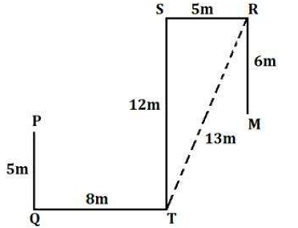 Point P is 5m to the north of Point Q. Point S is 5m west of Point R. Point M is 6m south of Point R. Point T is 12m south of Point S. Point Q is 8m west of Point T.