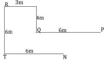 A person is standing at point P he starts walking and walks for 6m towards his west and reached point Q then he takes a right turn and walks for 4m then he takes a left turn and walks for 3m and reached point R then he takes a left turn and walks for 6m then reached at point T then again, he takes a left turn and walks for 6m and stopped at point N.