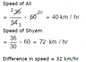 Ali travels at a speed of X kmph to cover a distance of 36 km in 54 min. Shyam takes 30 mins to cover same distance. Find the difference of their speed.