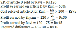 Ravi sold article ‘D’ to Shyam who again sold it at 25% profit. Find the difference between profit earned by Ravi to profit earned by Shyam.