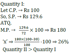 Quantity I: When an article sold at 28% discount then profit earned is 29.6%. ‘x’ is the profit % when article sold at 30% discount.