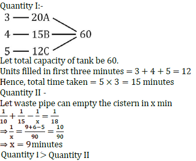 Quantity I: Time taken to fill the tank when A, B and C are opened in every alternate minute starting with A and ending with C. A, B and C alone takes 20 minutes, 15 minutes and 12 minutes respectively to fill the tank.