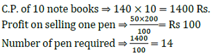 Cost price of a pen is 50 Rs. and that of notebook is 140 Rs. If pen is sold at 200% profit, then to purchase 10 such note books how many pens are required to sell if only profit money is used to buy notebooks?