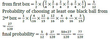 At least one black can be chosen in three ways: 1. first one is black, second is non-black 2. first one is non-black, second is black 3. both are black. Probability of selecting a box is 12 Now, probability of choosing at least one black ball