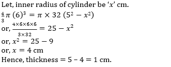 A solid sphere of radius 6 cm is melted and re-casted into a hollow cylinder of uniform thickness. If the external radius of the base of the cylinder is 5 cm and its height is 32 cm, find the uniform thickness of the cylinder ?