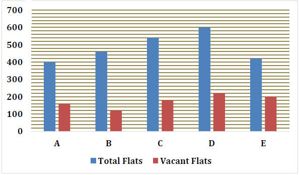 Direction (): Read the data given below and answer the following questions. The bar graph given below shows the total no. of flats and no. of vacant flats in five buildings.