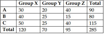 Direction (): the data given below shows the information of total students in class A, B and C which are divided in three groups X, Y and Z. Class A: Total no. of students are 90. 30 students are in group X. ratio of number of students in group Y and Z is 1: 2. Class B: Total no. of students are 80. The ratio of no. of students in group X, Y and Z is 8: 5: 3. Class C: the no. of students in group Y are half of that in group X. The no of students in group X of class C are 20 more than that in group X of class A. no. of students in group Z of class C are 20% less than that in group X of same class.