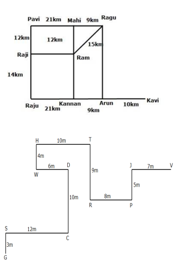 On the Beach, some persons are standing at a certain distance. Ram stands 15km south-west of Ragu. Raji stands 12km south of Pavi and 14km north of Raju. Arun stands south of Ragu and east of Raju. Kavi stands 10km east of Arun. Pavi stands 30km west of Ragu. Kannan stands 21km east of Raju and south of Ram.