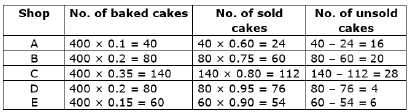 No. of cakes sold by B after 20% increase = 120% of 60 = 72 No. of unsold cakes for B = 80 – 72 = 8 Thus, the number of cakes unsold by Shop B is still more than two shops, i.e. D and E.
