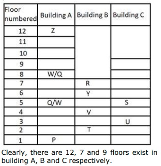 Direction : Study the following information carefully and answer the questions given below: Ten people live in three buildings namely A, B and C. Building A is to the immediate left of building B whereas building C is to the second right of building A. A maximum of four people live in a building. Note: Immediately above or below implies that the person is not in the same building. As many floors are there below the floor, in which T lives, as it is above the floor in which Y lives. There are four floors above the floor in which S lives. S doesn’t live in building B but lives at floor number 5. Z lives in that floor number, which is the sum of the floor number in which R and S live. The sum of the floor number in which P and T lives is 3 and both lives in different building. R lives in building B and lives at the topmost floor. T and Y live in same building but they do not live in building A. The sum of the number of the floor in which T and V lives is equal to the floor number in which Y live. T lives in the even numbered floor. Equal number of floors are there below the floor in which Q lives and above the floor in which W lives. There are two floors between W and Q. U lives on that floor number which is immediately below the floor number in which V lives. Only Two people live in Building C. S and U live in same building. R lives immediately two floor above the floor in which S lives.
