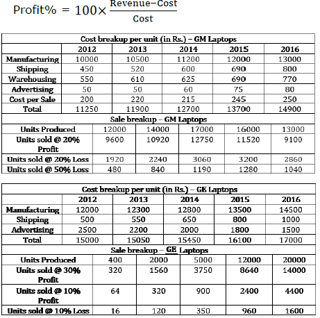 Direction (): Study the following information and table carefully to answer the given questions. GM and GE are two laptop manufacturing companies. GM sells its laptops through its own dealership network while GE sells its laptop online. Profit = (Revenue – Cost)