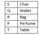 I. R purchage Bag. II. S doesn’t purchase Wallet. III. T purchage Perfume. IV. Q doesn’t purchage chair.