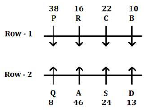 Direction: Read the following information carefully to answer the questions based on it. A, B, C, D, P, Q, R and S sit in a two-parallel row. Four people in each row. People seated in row-1 face towards the south and people seated in row-2 face towards north. People seated in row-1 face people seated in row-2. All people have a different number of chocolates. Q has 8 chocolates less than R. The one who has 10 chocolates faces the one who has 13 chocolates. One person sits between P and C who has 22 chocolates. P faces the one who sits immediate left of A . S has fewer chocolates than A. A does not like 13 chocolates. One person sits between A and D. Three people sit to the left of the one who faces Q who faces towards the north. The one who has 38 chocolates sits immediately to the right of R. S has thrice as many chocolates as Q has. A has 8 chocolates more than P. The sum of the total number of chocolates having the people sitting in row-1 is 86. One person sits between S and the one who sits opposite the person who has 38 chocolates. Two people sit between the one who has 13 chocolates and Q.