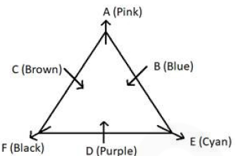Direction (): Study the information carefully and answer the questions given below. Six persons sit around a triangular table such that three of them sit at the corners and the rest on the middle of the side. The one who sits at the corner face away from the center and the one who sit at the middle of the side face towards the center. They also like different colours i.e. black, brown, blue, pink, purple and cyan. The one who likes black colour sits at the corner. The one who likes cyan colour sits immediate right to the one who likes purple colour. C sits second to the right to B, who likes blue colour. D faces the center and sits 3rd right to the one who
