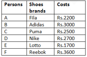 III. D bought shoes for Rs.2700, which were not of Fila. A and C did not buy Adidas shoes. E bought shoes worth lowest price. The cost of C’s shoes is more than that of A’s shoes but less than F’s shoes. F bought Reebok shoes.