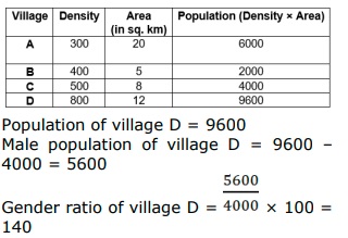 Direction : Study the following information carefully and answer the given questions: In the diagram, Population Density (in population per square kilometer) and Land Area (in square kilometer) of 4 villages A, B, C and D for the year 2001 is given. Population Density of a village = Total population of the village / Area (in square km) of the land of the village Gender Ratio of a village = (Total number of males in a village/Total number of females in a village) x100