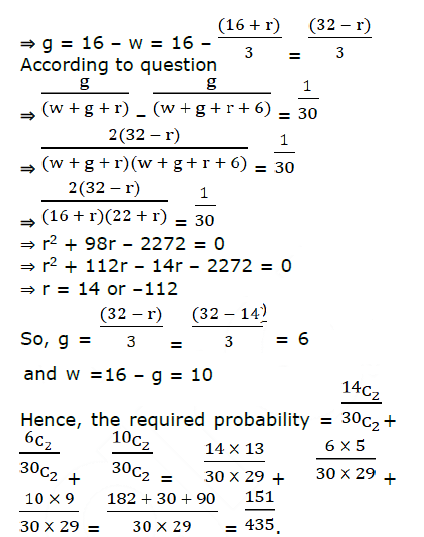 Let the number of white balls = w, the number of green balls = g and the number of red balls = r, then g + w = 16 Given = w/(w+g+r)=1/3 w/(16+r)=1/3