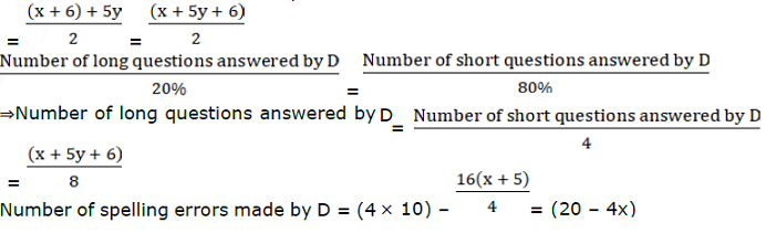 Directions (): Study the following information carefully and answer the given questions. In a school 4 students A, B, C and D appeared in an English examination which is consist of 15 short and 4 long questions are asked. Each of short question carry 5 marks and each of long questions carry 10 mark and for a spelling error 0.5 mark is deducted. For not attempting a question, zero marks is awarded. In the English exam, A answered (x + 6) short questions, x long questions and did (2x + 10) spelling errors. Ratio of number of spelling errors made by A and B is 8 : 3. Total marks scored by D is 86. Ratio of short and long questions answered by B In the English exam is 5 : 1 and he scored total 102 marks. C scored 35 marks more in short questions than long questions except spelling errors and the number of spelling errors made by C is equal to the difference of the number of spelling errors made by A and B. Number of short questions answered by D is average of that answered by A and B. Percentage of number of long questions answered among all the question answered by D is 20%. Average of the number of spelling errors made by all four students A, B, C and D is 10. Each student attempts integral number of short as well as long questions.