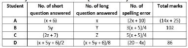 For C, number of short questions answered = (Number of long questions answered by B × 10 + 35)/5 = (2z + 7) Number of short questions answered by D is average of that answered by A and B