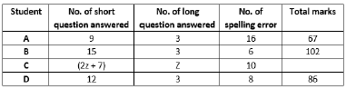 ∴ The number of question short and long questions answered, number of spelling errors and total marks scored will be as follow