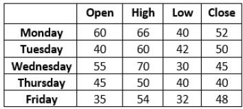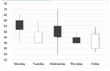Direction () : Study the following information carefully and answer the given questions. The following chart shows the opening, closing, high and low price of a share of a company XYZ on given 5 days-Monday, Tuesday, Wednesday, Thursday and Friday. Opening and closing price of the shares of the company XYZ are represented by ceiling and floor of the black box and floor and ceiling of the white box respectively. The high and low price of the share of the company XYZ are represented by ceiling and floor of the line respectively. For example: On Monday, opening price = 60, closing price = 52, high price = 66 and low price = 40