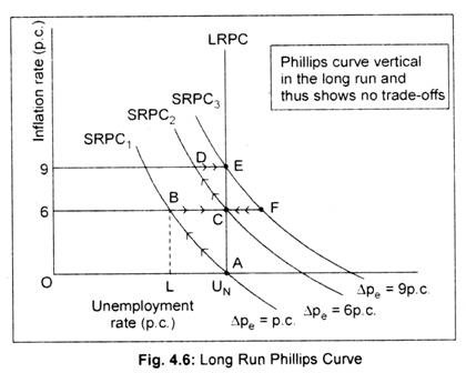 In Fig. 4.6 we have drawn the long run Phillips curve as a vertical line through the ‘natural rate of unemployment’. Further, we have drawn three short run Phillips curves (SRPC1, SRPC2 and SRPC3) representing different expected rates of inflation. The curve SRPC1 shows ‘zero’ inflationary expectations (Pe = 0 p.c.) and a high rate of unemployment or NRU, UN. SRPC2 shows a high expected rate of inflation, say 6 p.c. (Pe= 6 p.c.). SRPC3 shows more higher expected inflation rate, say 9 p.c. (Pe = 9 p.c.).