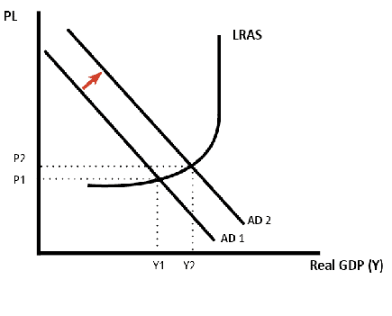 An increase in aggregate demand (AD to AD2) causes higher real GDP (Y1 to Y2). Therefore firms employ more workers and unemployment falls. However, as the economy gets closer to full capacity, we see an increase in inflationary pressures. With lower unemployment, workers can demand higher money wages, which causes wage inflation. Also, firms can put up prices due to rising demand. Therefore, in this situation, we see falling unemployment, but higher inflation.