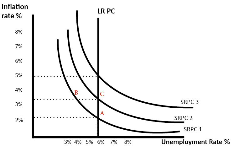 We assume that the economy initially is at point A in Fig. 4.6 at the NRU, i.e., UN with a zero actual and expected inflation rate. Further, we assume that the government thinks that this unemployment rate is pretty high and thus, takes step to reduce unemployment rate to OL. Adoption of policy measures say, expansion in money supply causes aggregate demand to rise, and thus, wage rate to rise say by 6 p.c., and the level of unemployment to drop from OA to OL. This may cause a rise, say, 6 p.c. in the price level. The economy then moves from point A to B, thereby suggesting a higher inflation rate and a lower unemployment rate along the SRPC1.