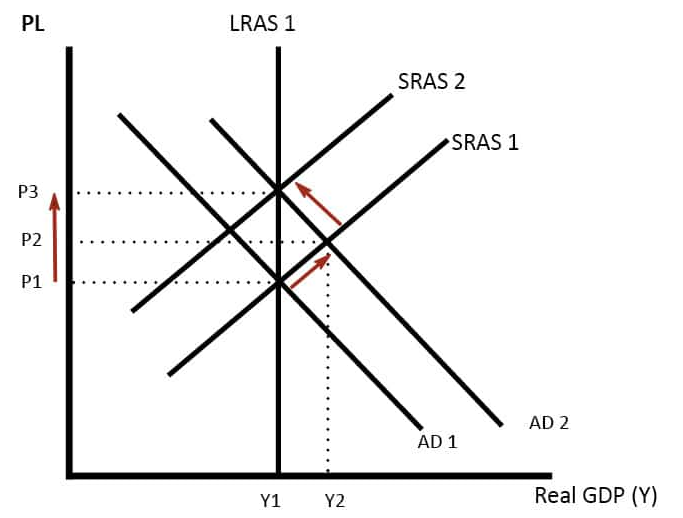 However, this increase in AD causes inflation, and therefore, real wages stay the same. When they realise real wages are the same as last year, they change their price expectations, and no longer supply extra labour and the real output returns to its original level. Therefore, unemployment remains unchanged, but we have a higher inflation rate. The short-run Phillips curve shifts upwards to SRPC 2