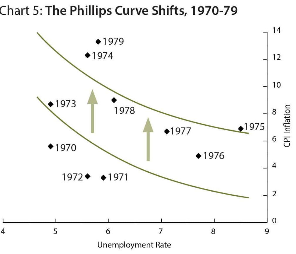 Evidence from the 1970s suggested the trade-off between unemployment and inflation had broken down. The 1970s witnessed a rise in stagflation – rising unemployment and inflation. Monetarists argued that increasing the money supply just led to a wage inflation spiral and did not help to reduce unemployment. They advocated reducing the money supply and achieving low inflation – any unemployment would just prove temporary.