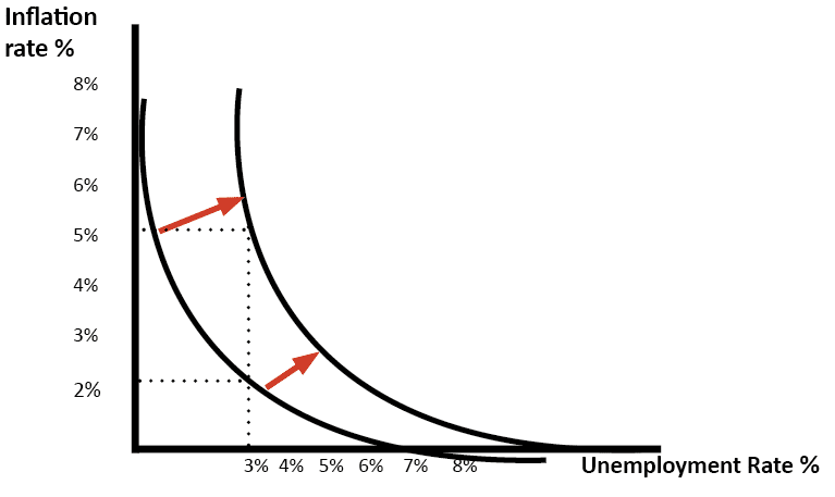 However, others argued there was still a trade-off – the Phillips curve had just shifted to the right giving a worse trade-off because of cost-push inflation.