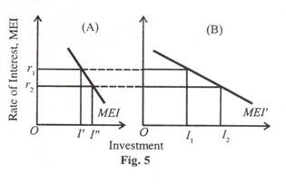 In Figure 5 the vertical axis measures the interest rate and the MEI and the horizontal axis measures the amount of investment. The MEI and MEI’ are the investment demand curves. The MEI curve in Panel (A) is less elastic to investment which increases by I’I’’. This is less than the increase in investment I1I2 shown in Panel (B) where the MEI’ curve is elastic. Thus given the shape and position of the MEI curve, a fall in the interest rate will increase the volume of investment.