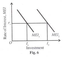 On the other hand, given the rate of interest, the higher the MEI, the larger shall be the volume of investment. The higher marginal efficiency of investment implies that the MEI curve shifts to the right. When the existing capital assets wear out, they are replaced by new ones and level of investment increases.