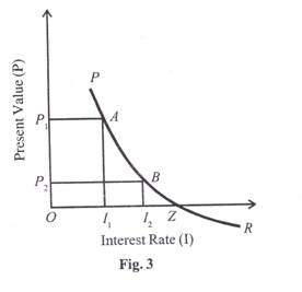 The relation between the present value and the rate of interest is shown in Figure 3, where the rate of interest is taken on the horizontal axis while the present value of the project on the vertical axis. The curve PR shows the inverse relation between the present value and the rate of interest. If the current rate of interest is ii the present value of the project is P1 On the other hand, a higher rate of interest (i2) will lead to a lower present value (P2) when the present value curve (PR) cuts the horizontal axis at point (Z), the net present value becomes zero.