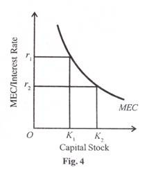 Figure 4 shows the MEC curve of an economy. It has a negative slope (from left to right downward) which indicates that the higher the MEC, the smaller the capital stock. Or, as the capital stock increases, the MEC falls. This is because of the operation of the law of diminishing returns in production.
