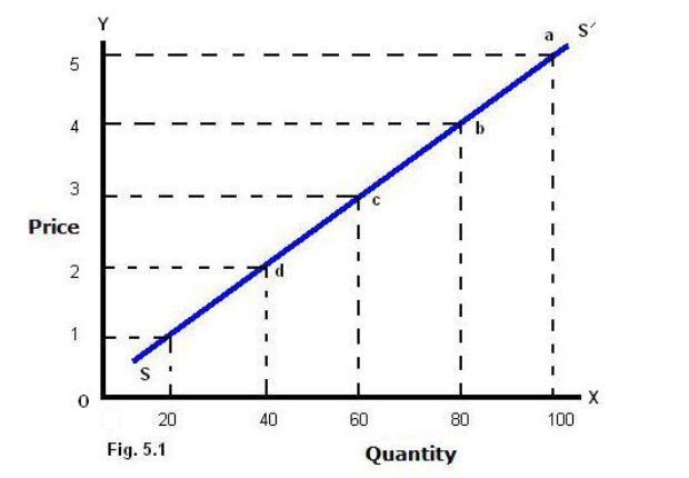 In the figure (5.1) price is plotted on the vertical axis OY and the quantity supplied on the horizontal axis OX. The four points d, c, b, and a show each price quantity combination. The supply curve SS/ slopes upward from left to right indicating that less quantity is offered for sale at lower price and more at higher prices by the sellers not supply curve is usually positively sloped.