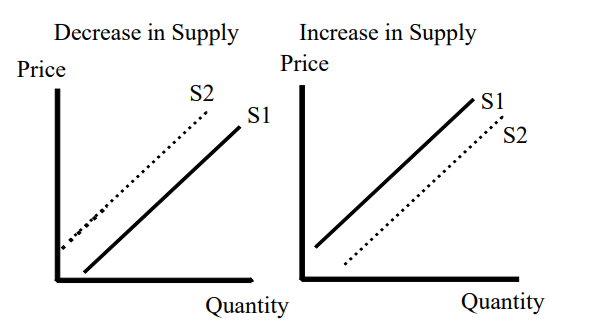 A decrease in supply is shown in the first panel, notice that there is a lower quantity supplied at each price with S2 (dotted line) than with S1 (solid line). The second panel shows an increase in supply, notice that there is a larger quantity supplied at each price with S2 (dotted line) than with S1 (solid line).