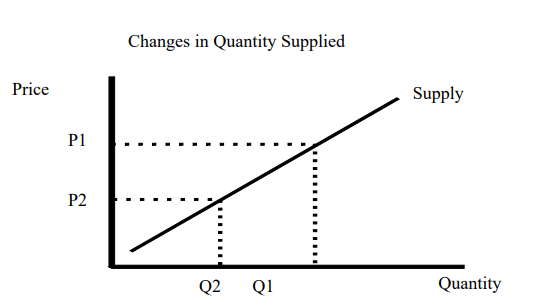 Changes in price cause changes in quantity supplied, an increase in price from P2 to P1 causes an increase in the quantity supplied from Q2 to Q1; a decrease in price from P1 to P2 causes a decrease in the quantity supplied from Q1 to Q2.