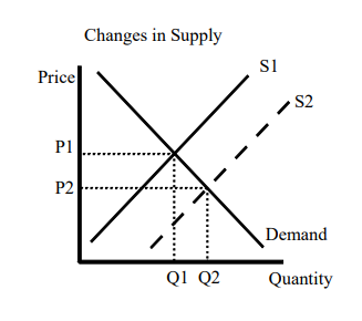 Considering the following graph, movement of the supply curve from S1 (solid line) to S2 (dashed line) is an increase in supply. Such increases are caused by a change in a nonprice determinant (for example, the number of suppliers in the market increased or the cost of capital decreased). With an increase in supply there is a shift of the supply curve to the right along the demand curve, therefore equilibrium price and quantity move in opposite directions (price decreases, quantity increases). If we move from S2 to S1 that is called an decrease in supply, possibly due to an increase in the price of a productive resource (capital) or the number of suppliers decreased. When supply decreases, equilibrium price increases and the quantity decreases as a result. That is the result of the supply curve moving up along the negatively sloped demand curve (which remains unchanged).