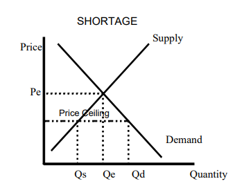 For a price ceiling to be effective it must be imposed below the competitive equilibrium price. Note that the Qs is below the Qd, which means that there is an excess demand for this commodity that is not being satisfied by suppliers at this artificially low price. The distance between Qs and Qd is called a shortage.