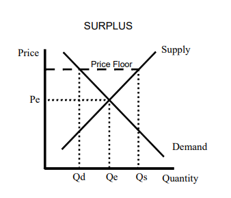 For a price floor to be effective it must be above the competitive equilibrium price. Notice that at the floor price Qd is less than Qs, the distance between Qd and Qs is the amount of the surplus. Implicit in these analyses is the fact that without government we could have neither shortage or surplus. In large measure, the suspicion of government is because it has the power to create these sorts of peculiar market situations. Even with the power of government to enforce law, the only way that a shortage or surplus could occur is if the price ceiling or the price floor were effective.